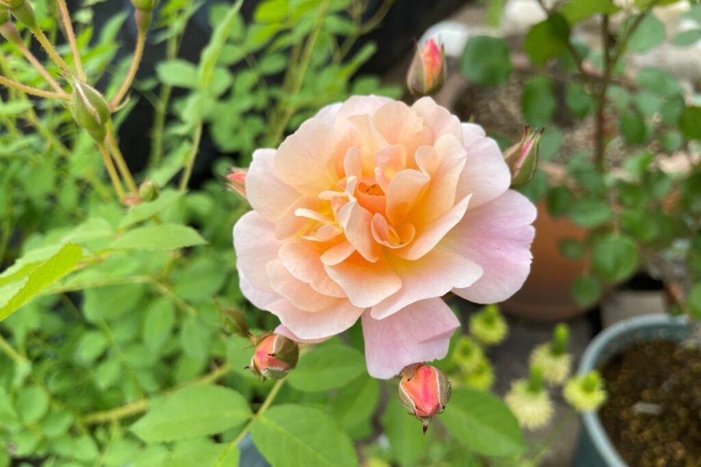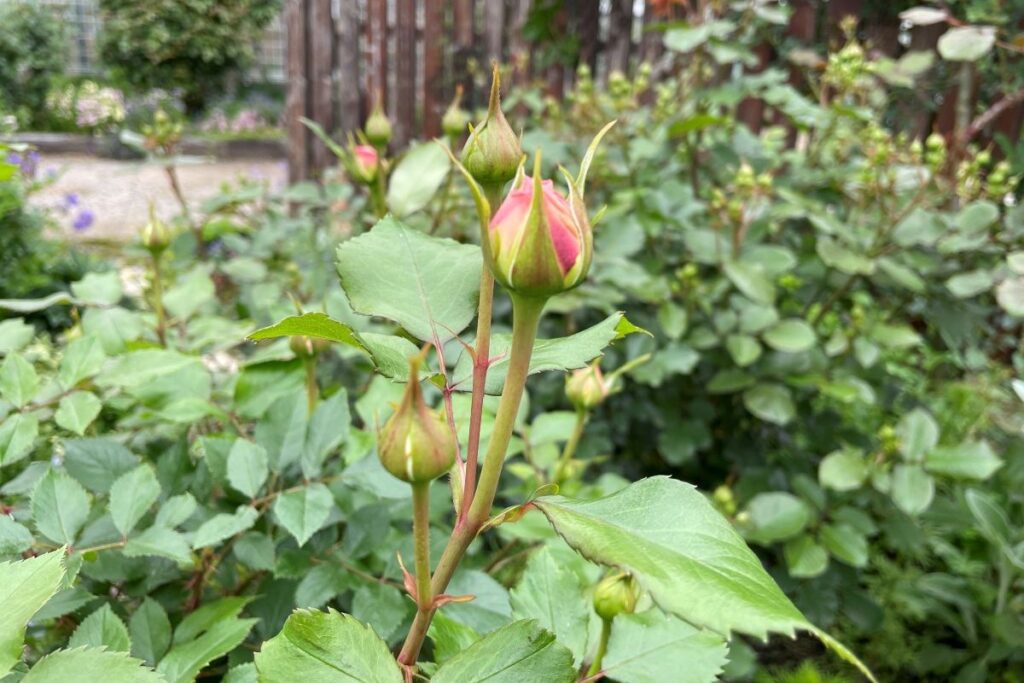 いよいよつぼみが膨らみ、バラが咲き始めた河本バラ園のお庭です。