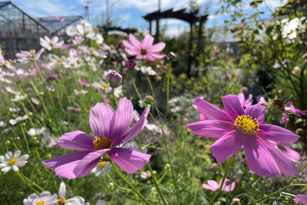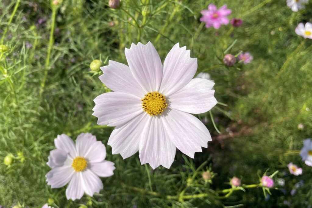 現在のお庭は、夏剪定を終えた後のバラがつぼみをつけ、花の準備を迎えています。咲いているバラは少しだけなのですが、それ以上にコスモスが美しく咲いています。