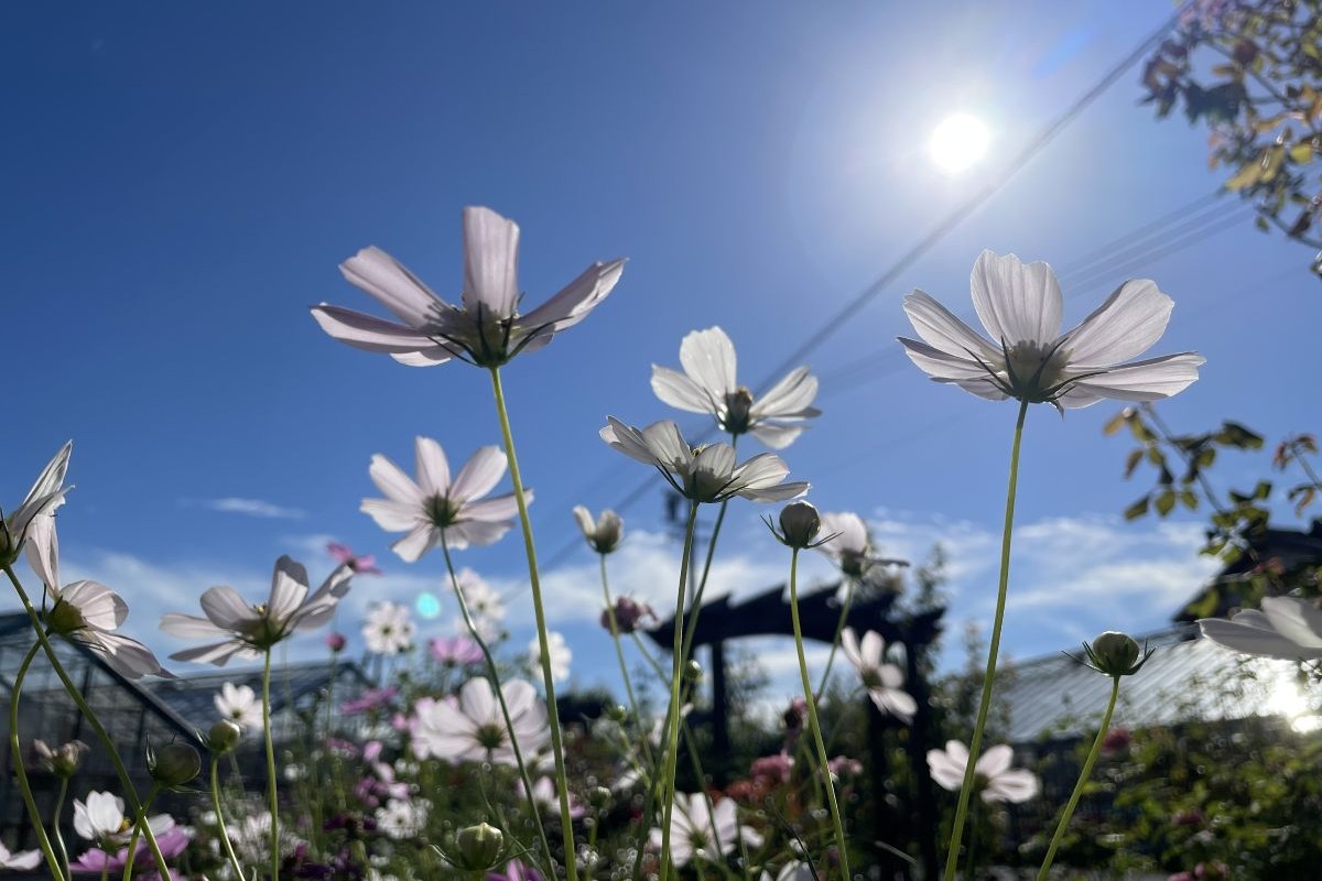 秋晴れの空に、今朝もコスモスが光を受けながらゆらゆらと揺れていました。ずっと見ていられそうです。